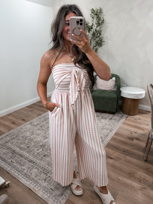 Coastal Glow Striped Strapless Jumpsuit - cream/pink