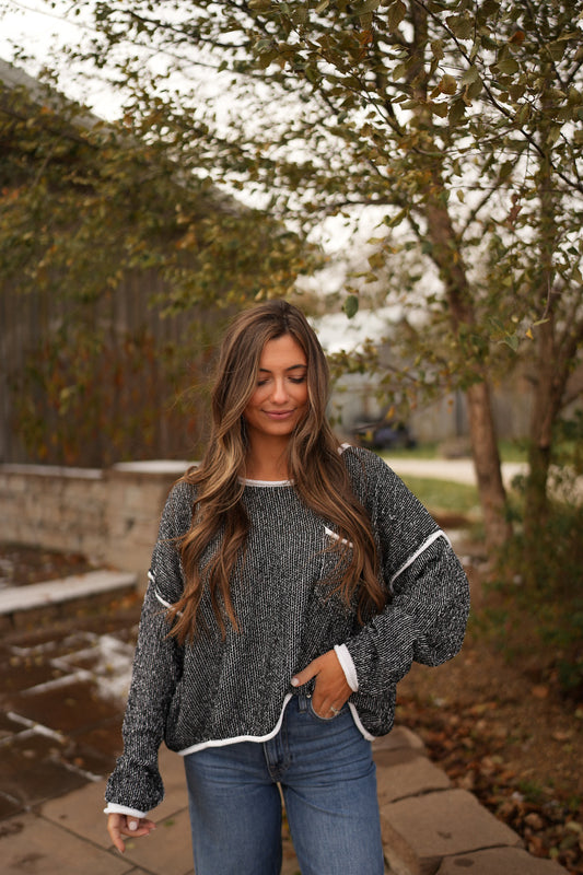 Contrast Trim Textured Sweater- Black DOORBUSTER!