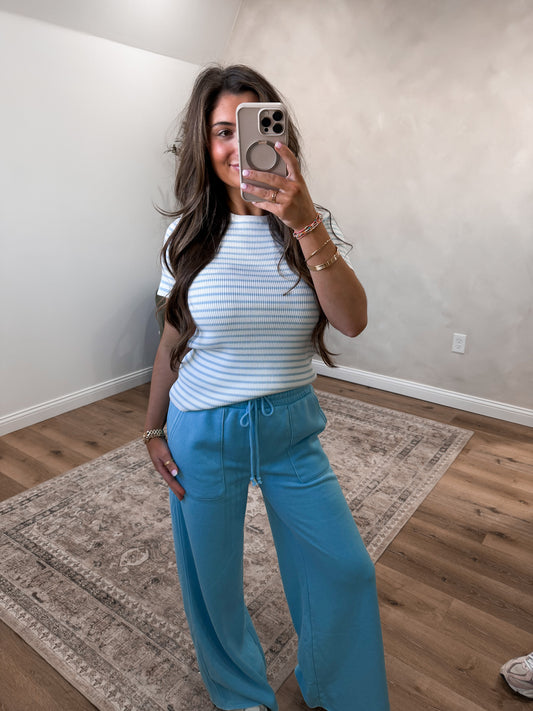 The Eva Striped Ribbed Tee - blue