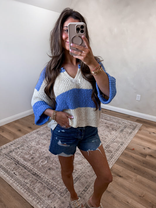 The Eliza Split Neck Stripe Sweater - cornflower blue