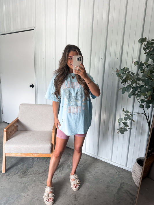 Distressed world tour tee- Light blue