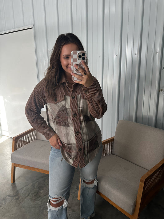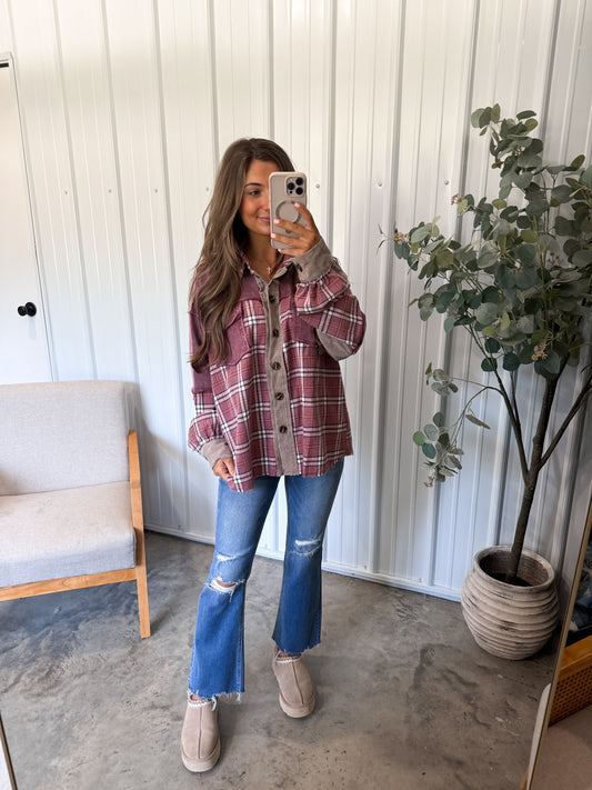 Corduroy Plaid Patchwork Shacket- Mulberry