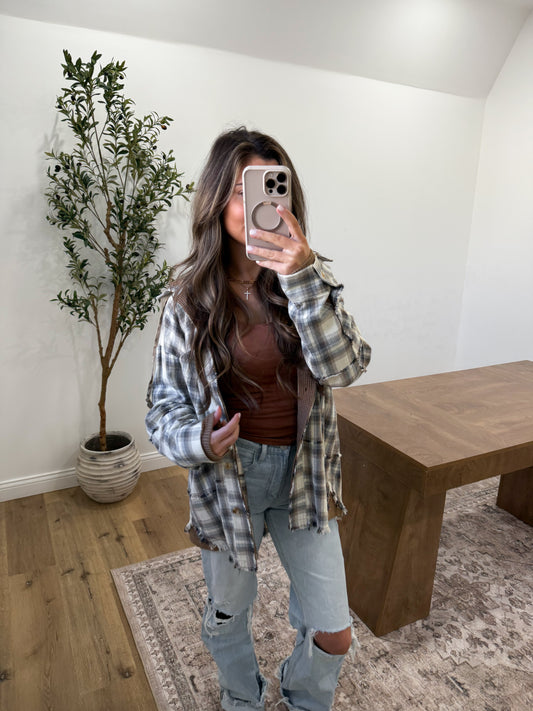 Cropped Plaid Shacket With Detachable Hood- Brown