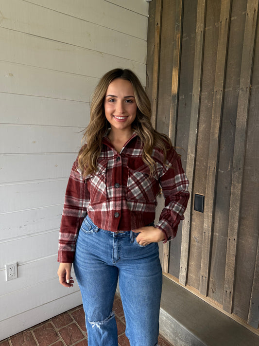 Cropped Plaid Shacket With Detachable Hood- Burgundy