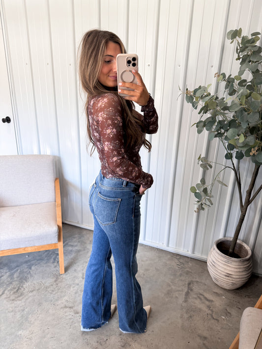 Havana High Rise Raw Hem Flare Jeans- Dark
