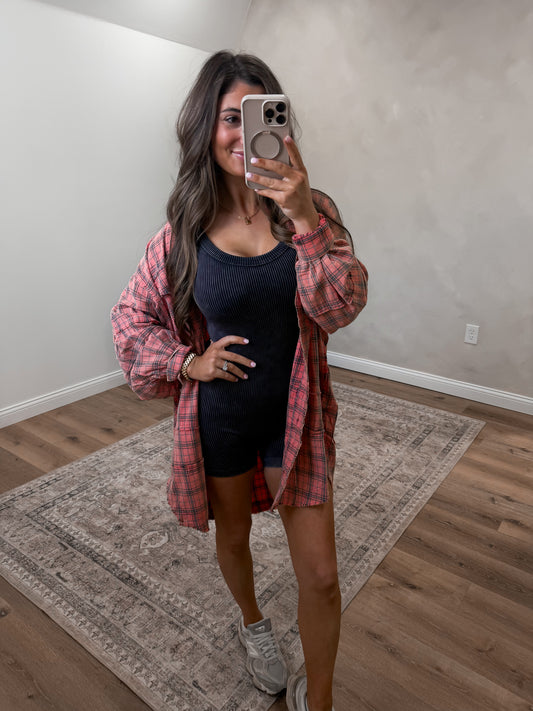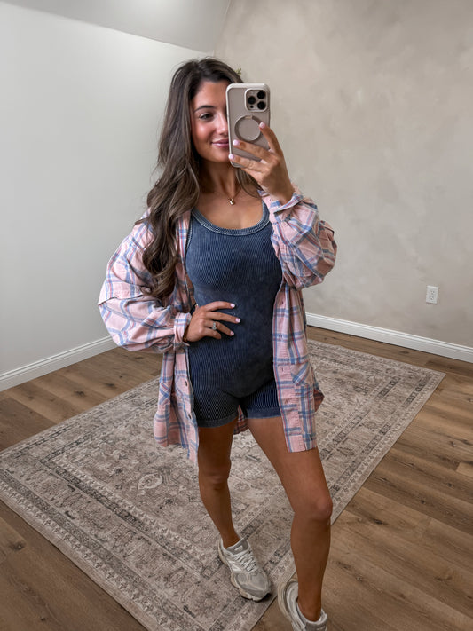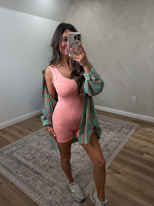 Stone Washed Ribbed Romper- coral
