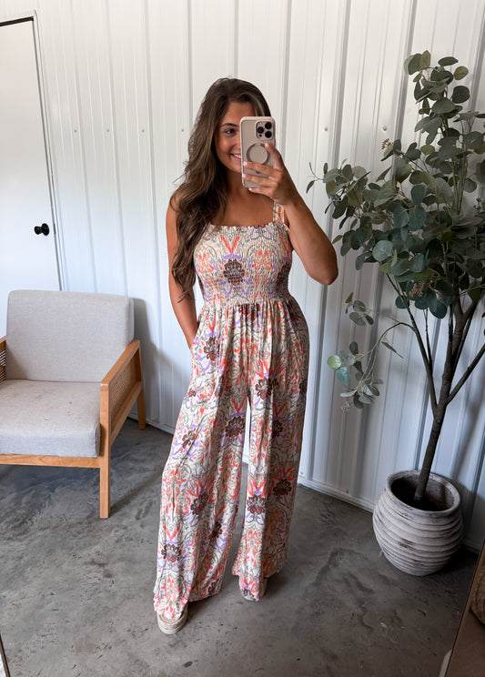 Sierra Smocked Jumpsuit- taupe multi