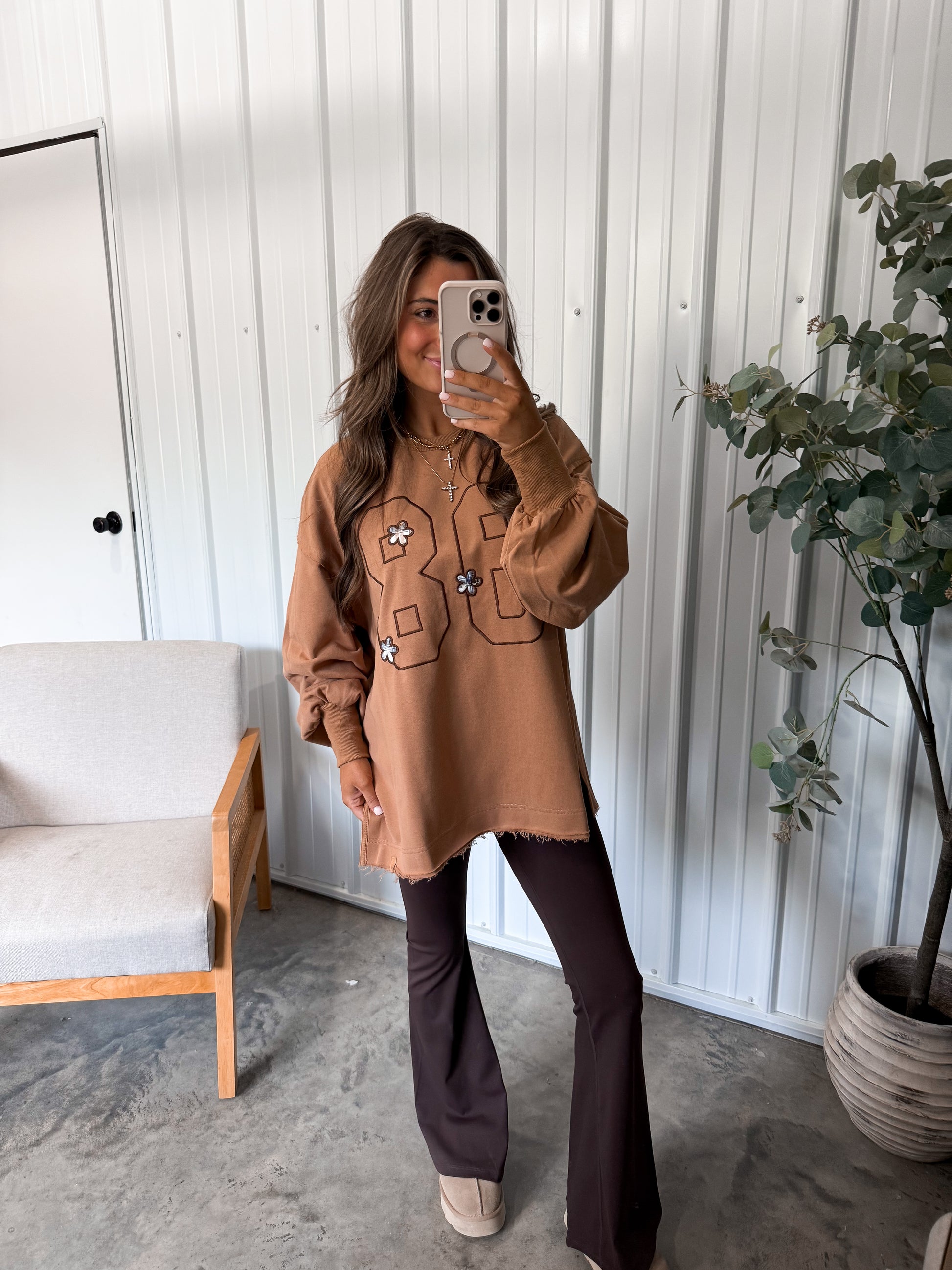 This oversized jersey pullover features delicate embroidery and playful printed flowers that overlay its classic style 68, creating a charming vintage-inspired look.