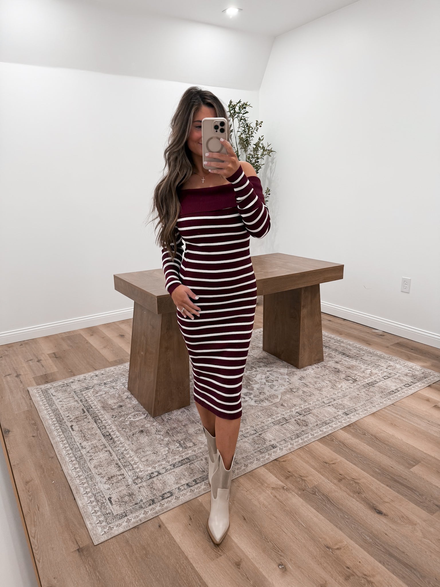 Slim-fit Off Shoulder Stripe Dress- Burgundy