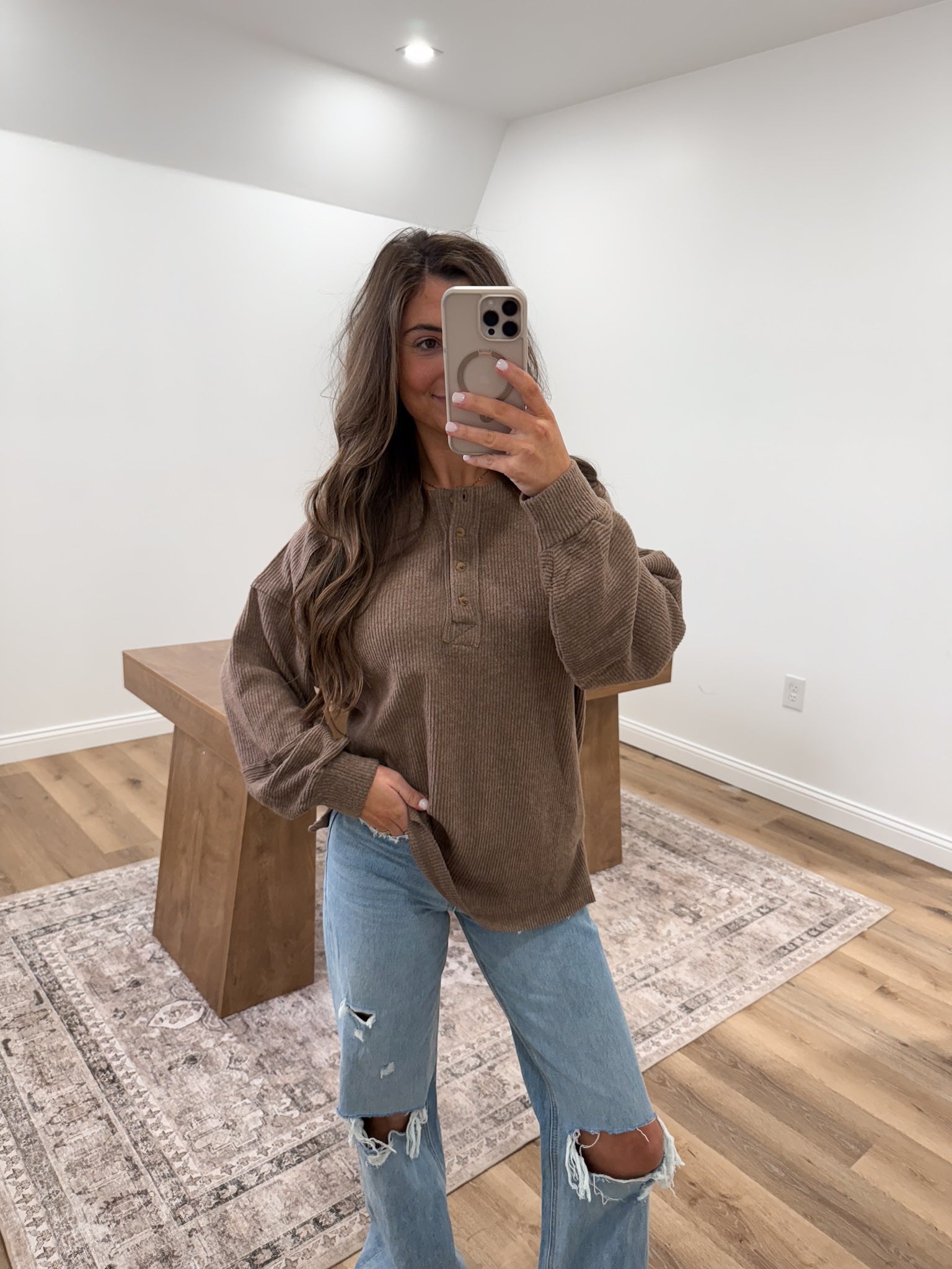 Discover timeless comfort with this brushed hacci melange henley, designed for those who appreciate quality and style. The soft, textured fabric drapes beautifully while ribbed detailing creates a polished silhouette. Practical side slits enhance mobility and add contemporary flair, while exposed seams deliver an intentional, fashion-forward aesthetic.