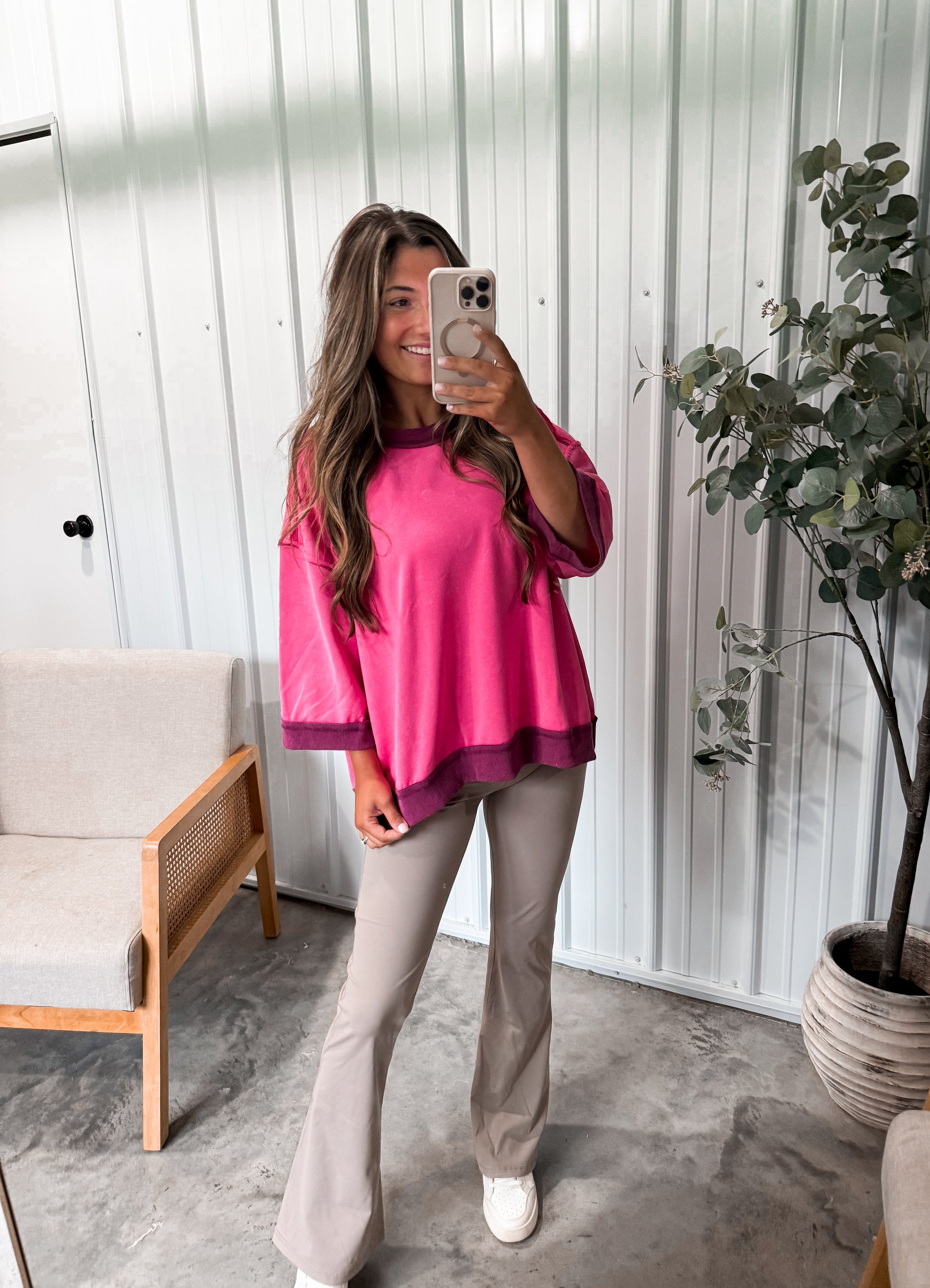 This French terry sweatshirt tee features striking contrast exposed seams and trim, adding a stylish edge to a comfortable, boxy fit. Available in two colors, it’s perfect for elevating your casual wardrobe.