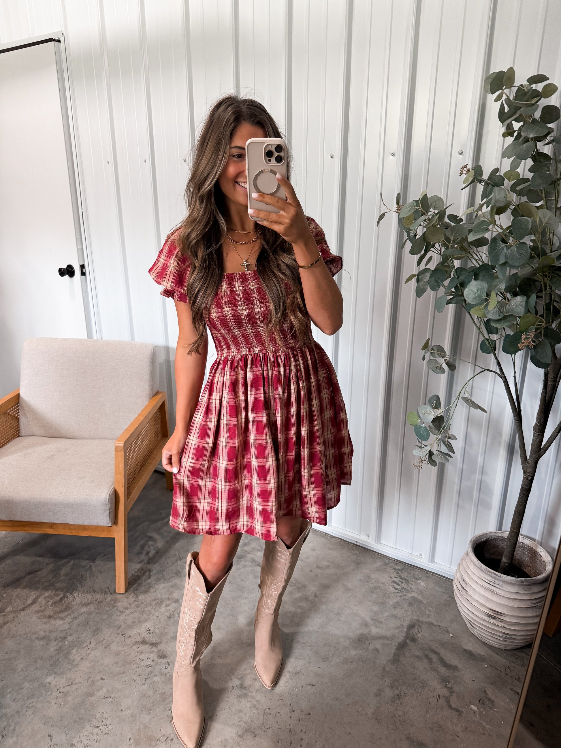 This red plaid mini dress features a smocked bodice and charming bubble short sleeves, falling gracefully to the knee for a perfect blend of comfort and style.