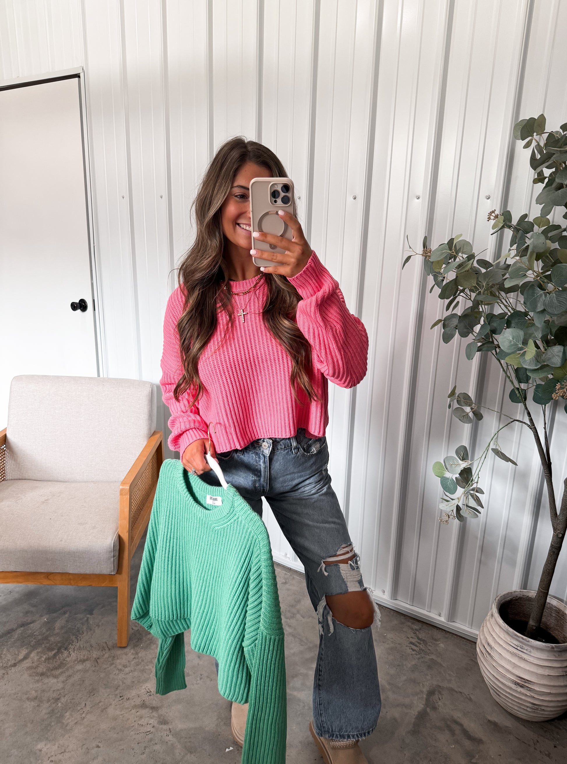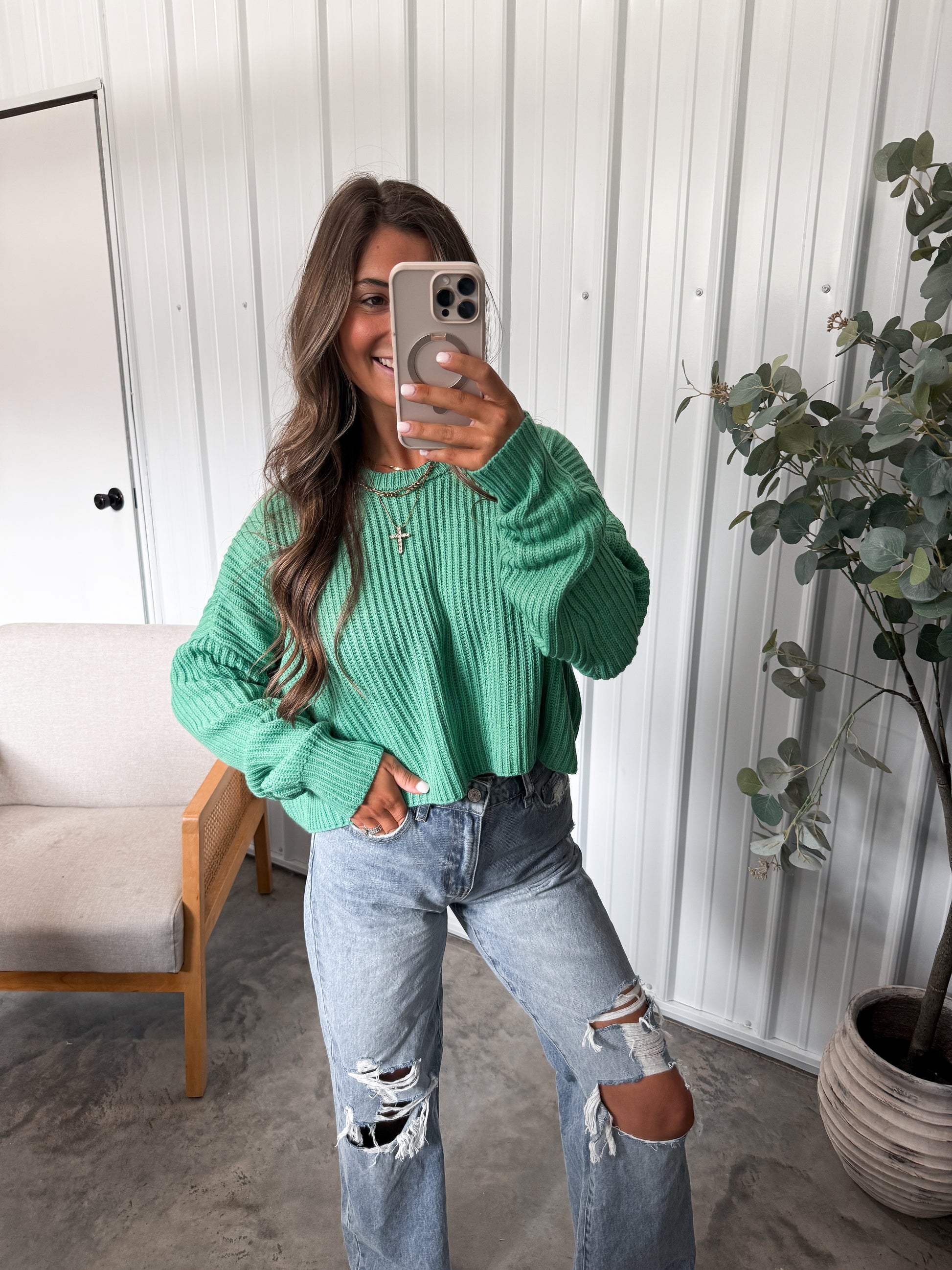 This stylish cropped sweater features a classic crew neck design, perfect for adding a trendy touch to any outfit.