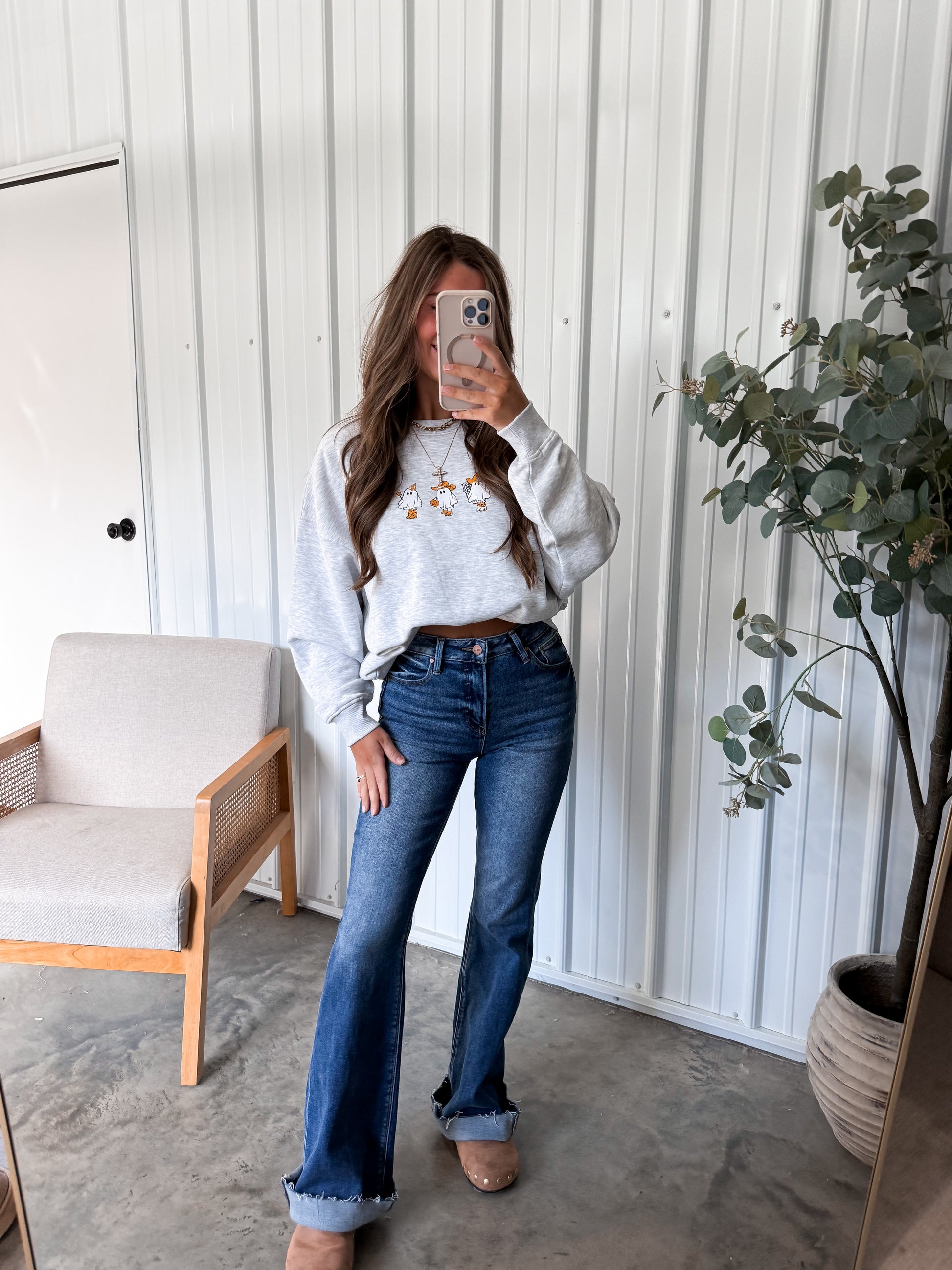 Celebrate Halloween in comfort with our Ghosty Trio Crew Neck sweatshirt. Featuring a relaxed fit and soft fleece fabric, this heather grey long-sleeve tee showcases a charming trio of ghost graphics perfect for the season. Cozy up in style while embracing spooky vibes effortlessly.