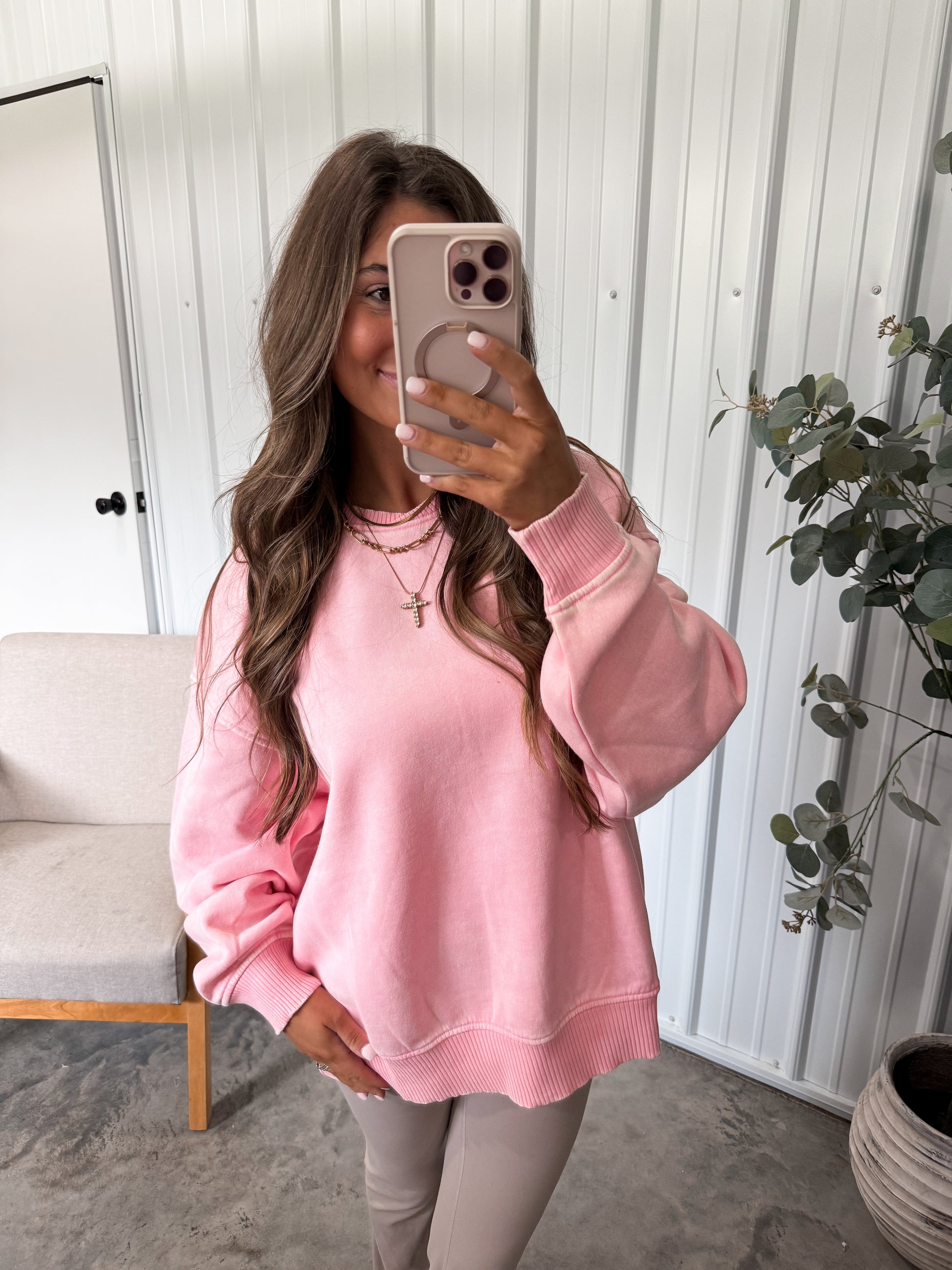 This acid-washed fleece oversized pullover features voluminous balloon sleeves and a stylish overlap neckband, combining comfort with standout design.