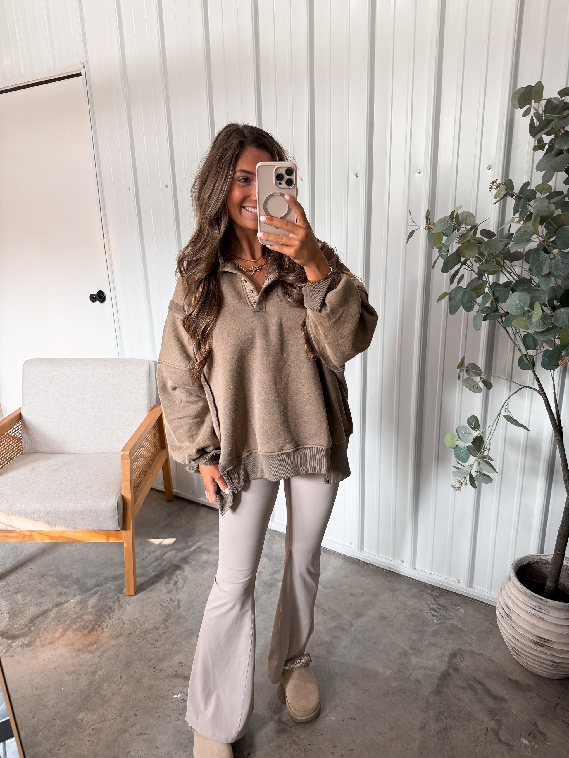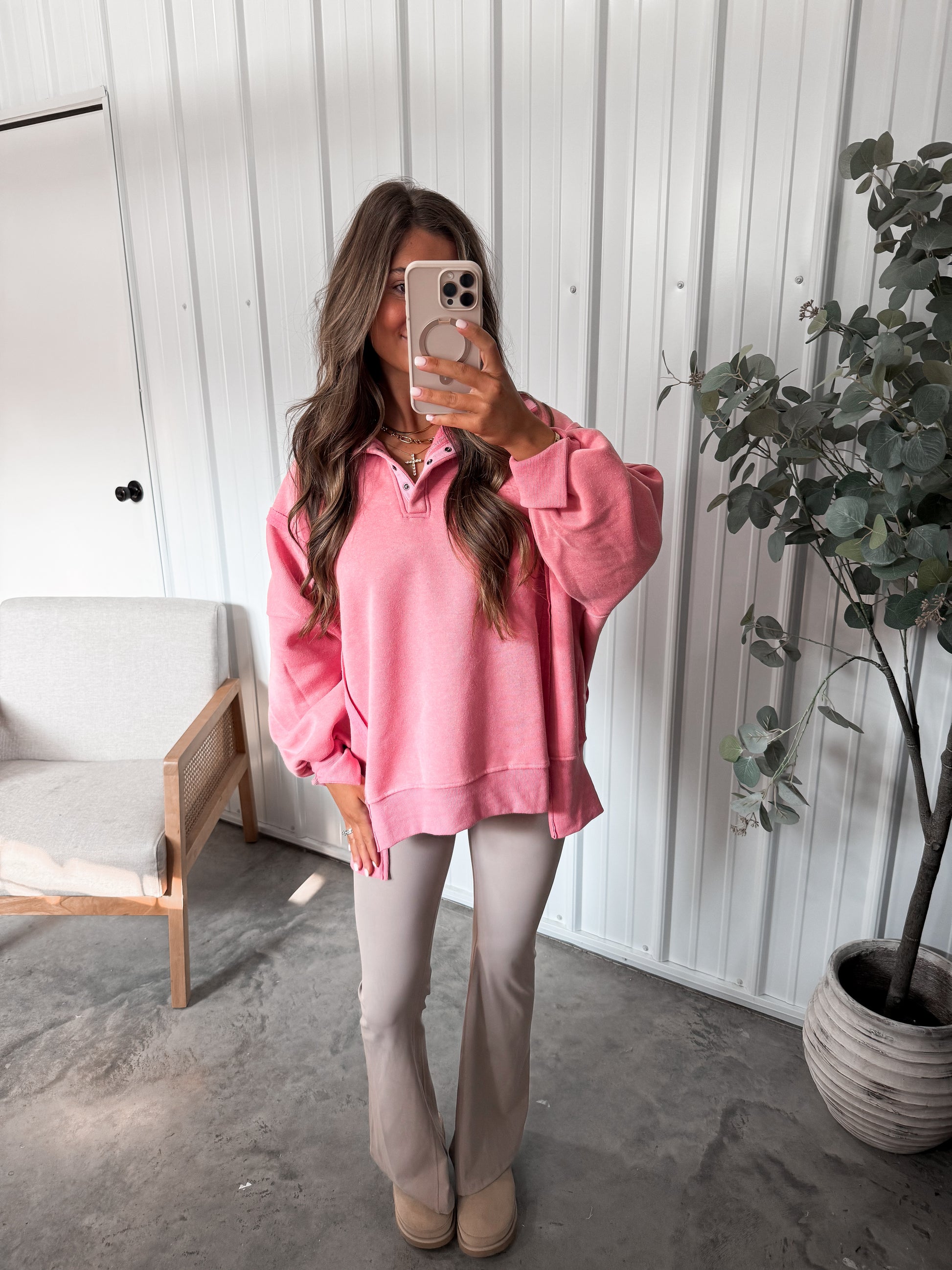 Upgrade your casual look with this distinctive polo-style pullover, featuring a refined mineral wash for a textured appearance. Its oversized, relaxed fit pairs perfectly with leggings or jeans, while the side slit detail adds a stylish touch.
