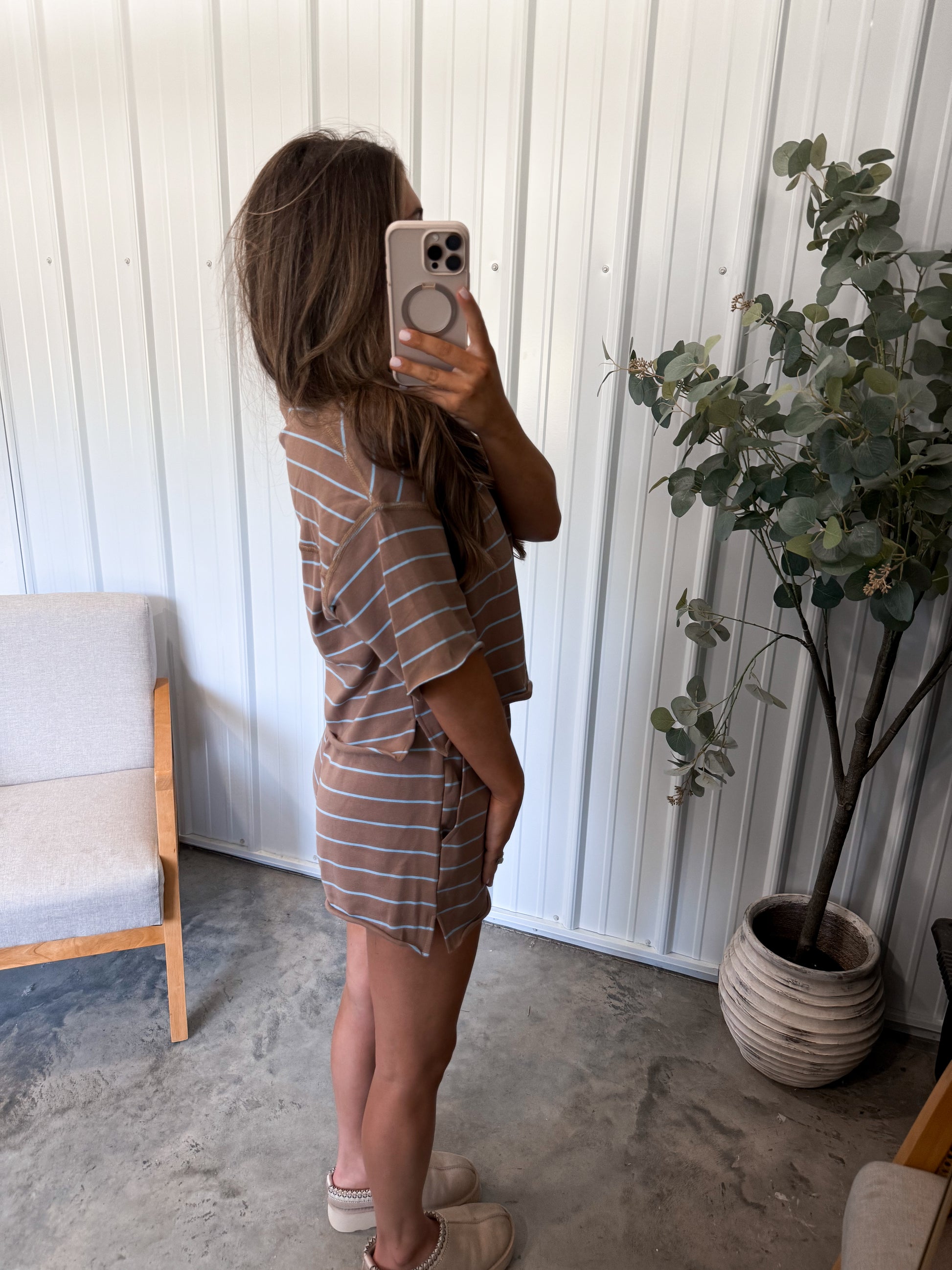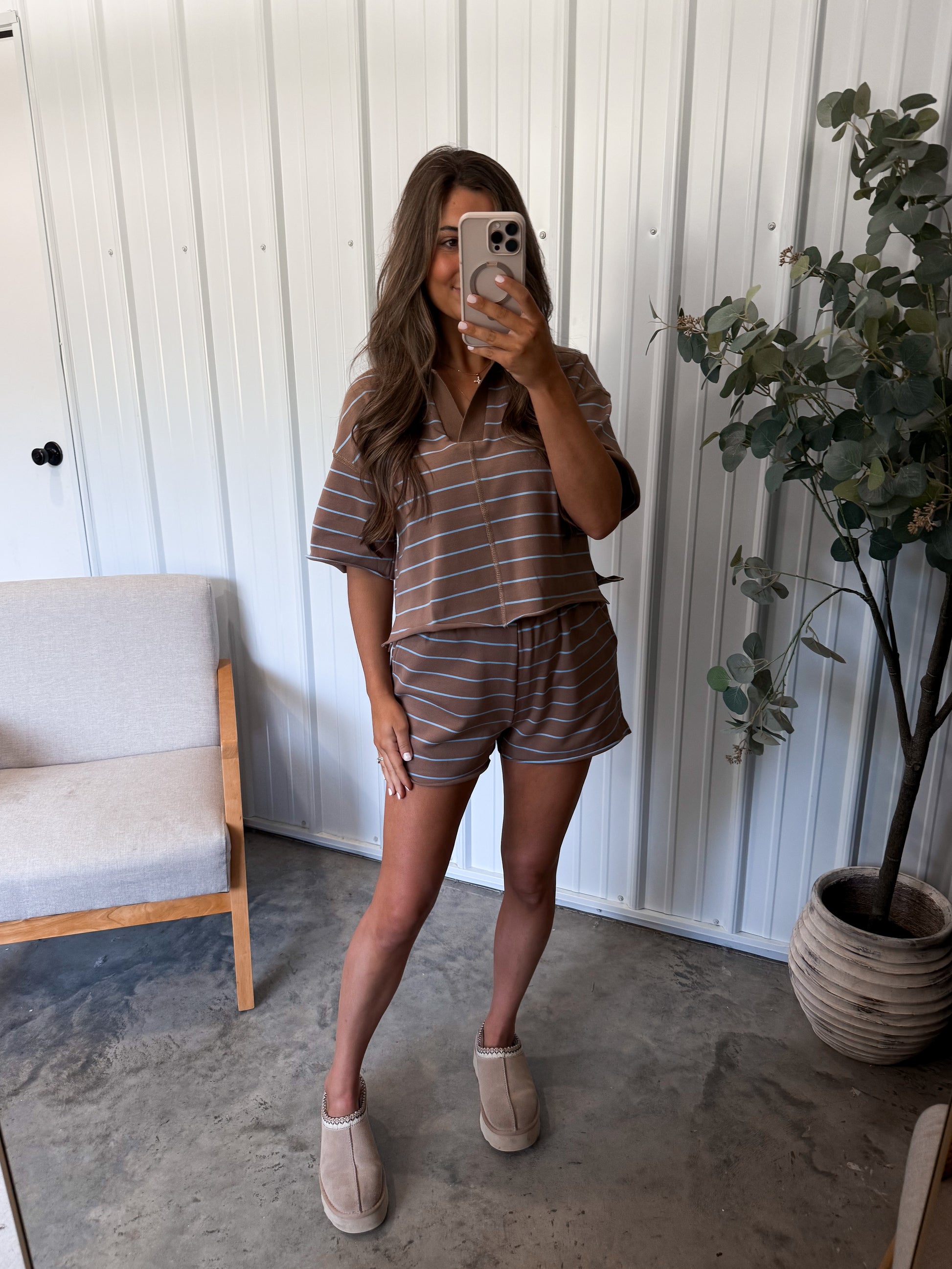 Relax in style with this cozy striped knit shirt paired perfectly with matching shorts for a complete lounge set.
