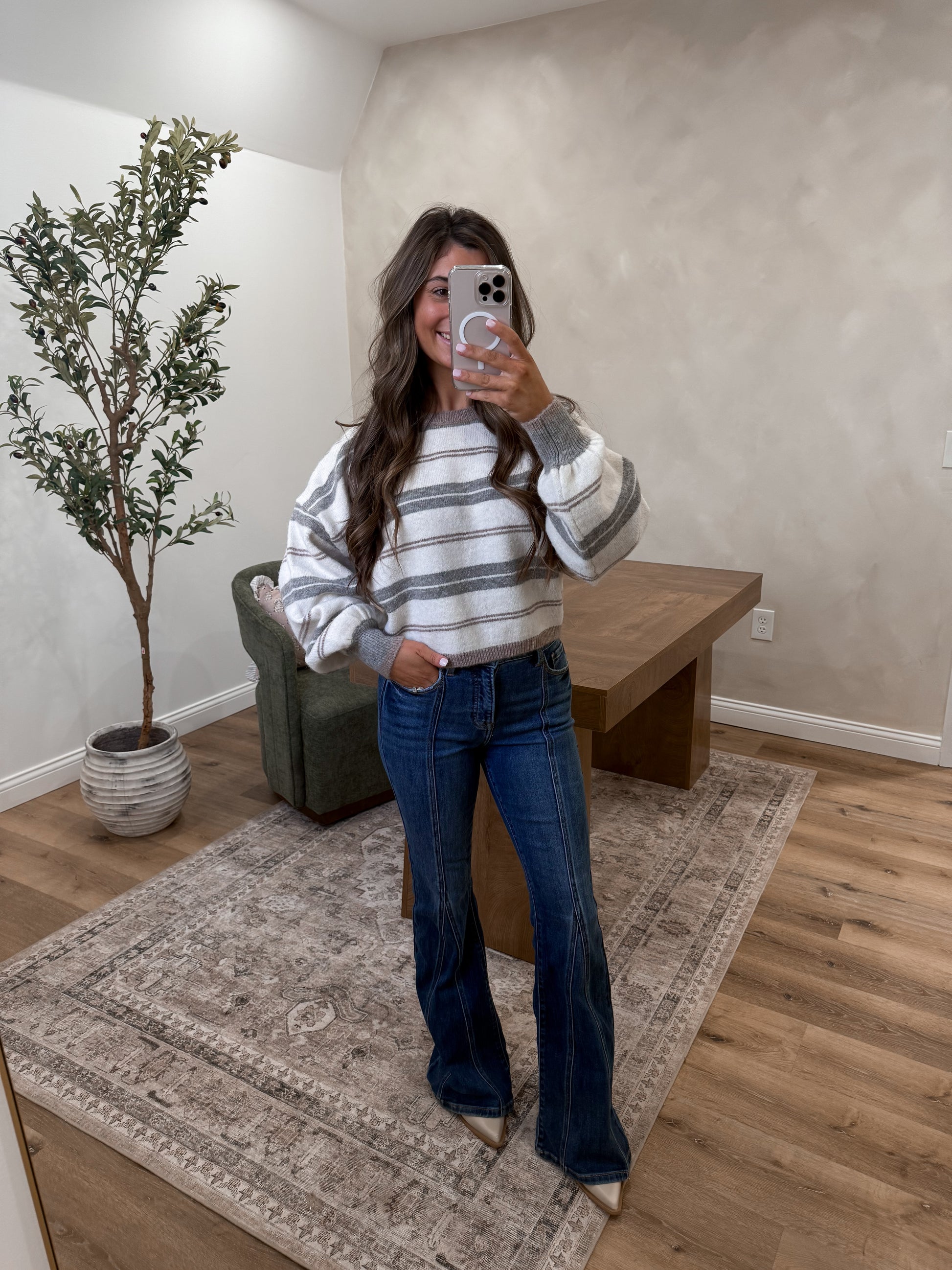 Elevate your everyday wardrobe with this effortlessly chic striped sweater. The relaxed silhouette drapes beautifully with generous dolman sleeves, while refined ribbed detailing at the collar, cuffs, and hem adds polished structure. A classic round neckline keeps the look timeless and versatile. Perfect for layering or wearing solo, this piece transitions seamlessly from casual weekends to relaxed office days.