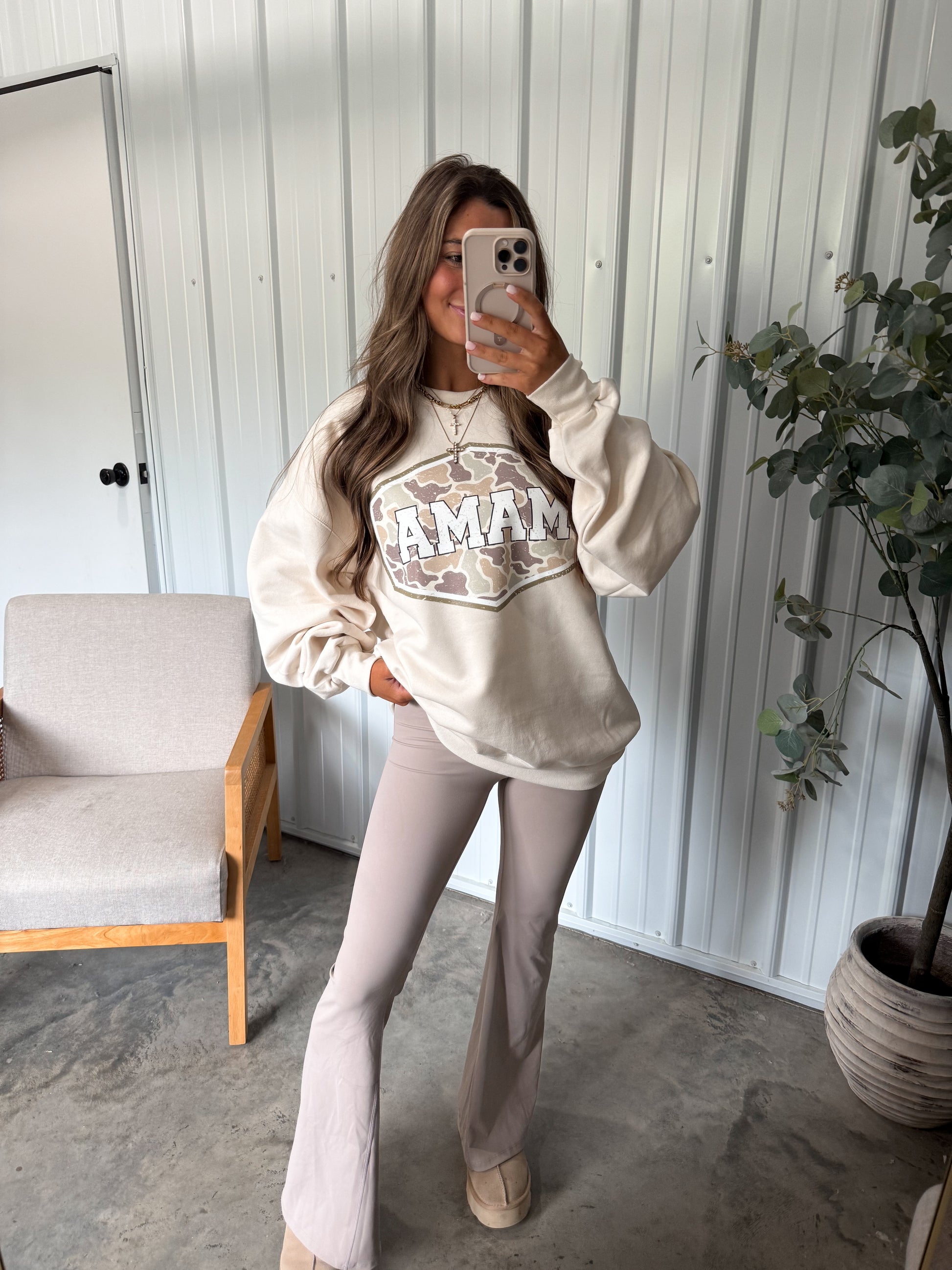 Stay cozy in this fleece crewneck featuring distinctive duck camo accents and a bold "mama" print on the front, perfect for blending comfort with style.