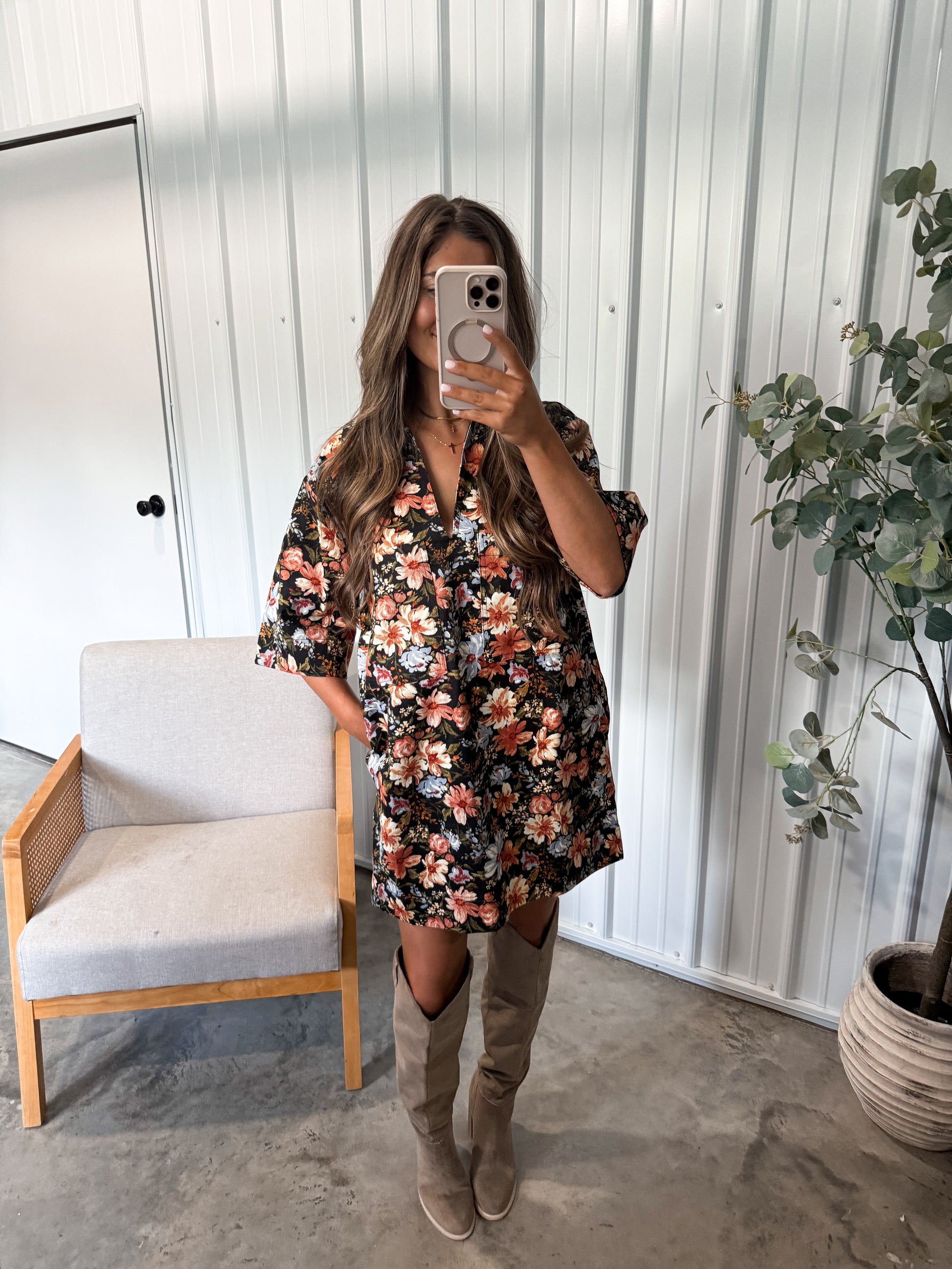 This denim dress showcases a deep midnight noir base adorned with fall florals, designed with a flattering V-neck and quarter-length sleeves for effortless style.