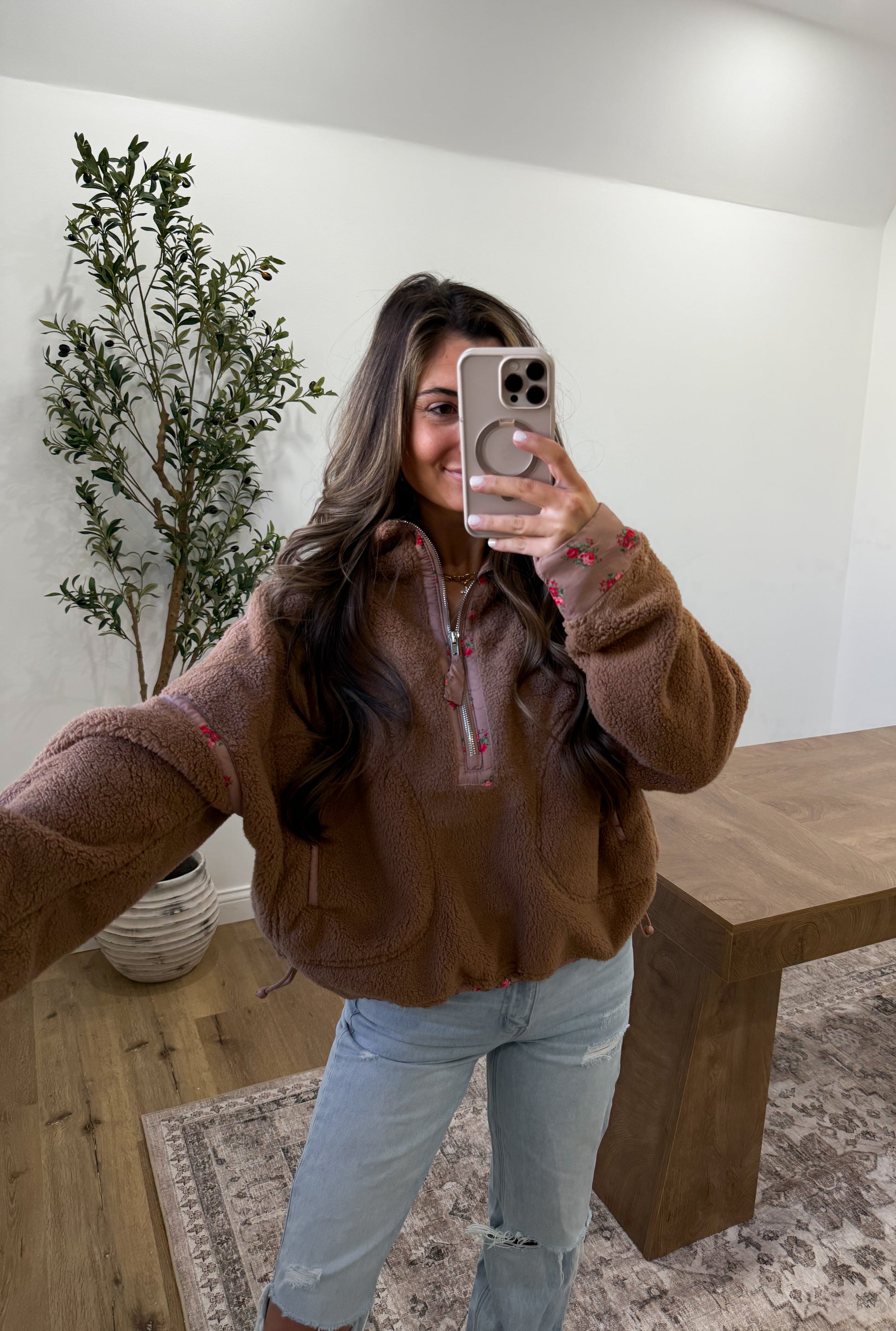 Cozy up in effortless style with this charming sherpa jacket, featuring delicate ditsy floral prints and refined binding edge details. Crafted in soft, luxurious sherpa fabric, this brown beauty combines warmth with understated elegance—a versatile piece that elevates any casual outfit while keeping you wrapped in comfort.
