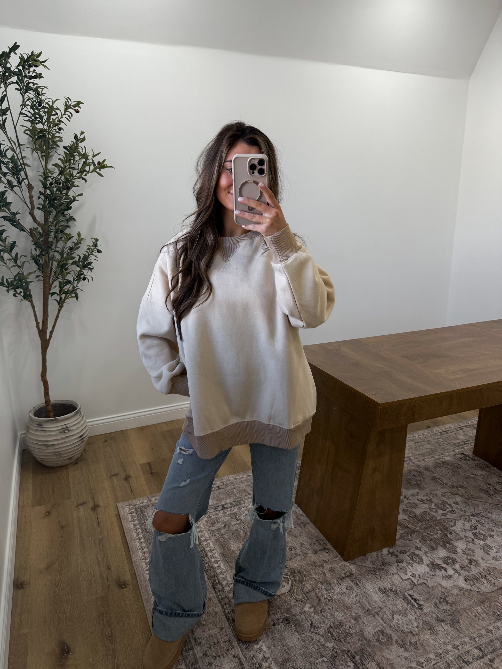 Embrace effortless comfort with this oversized sweatshirt, featuring a distinctive ribbed V-insert and soft washed fleece construction. The relaxed silhouette pairs perfectly with your everyday wardrobe, while the vintage taupe tone adds understated sophistication to any look. A timeless piece that feels as good as it looks.
