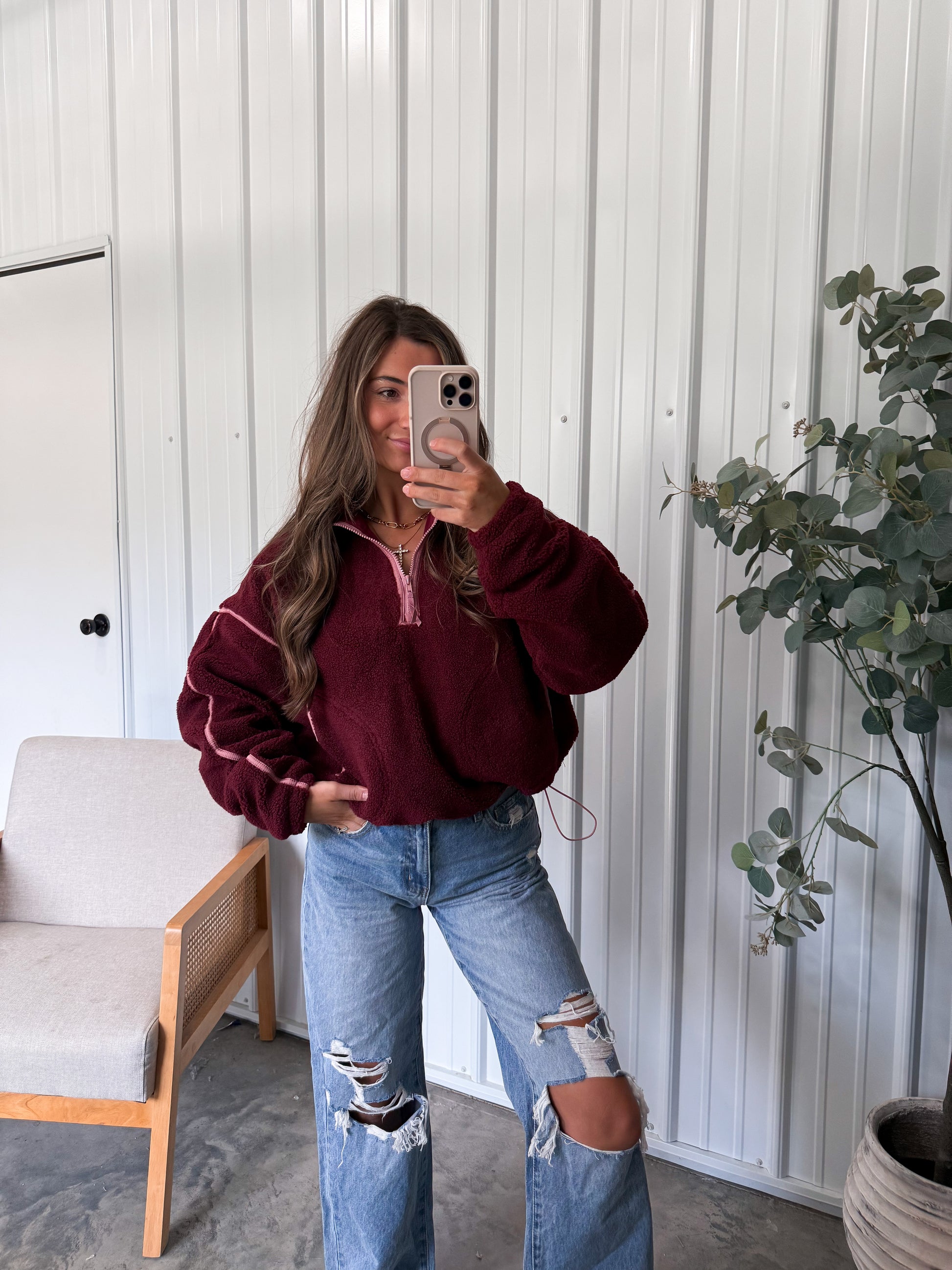 This cozy sherpa pullover features bold pink piping for a striking contrast. Designed with a half-zip front, it includes convenient side pockets and an adjustable elastic drawstring toggle at the hem for a perfect fit.