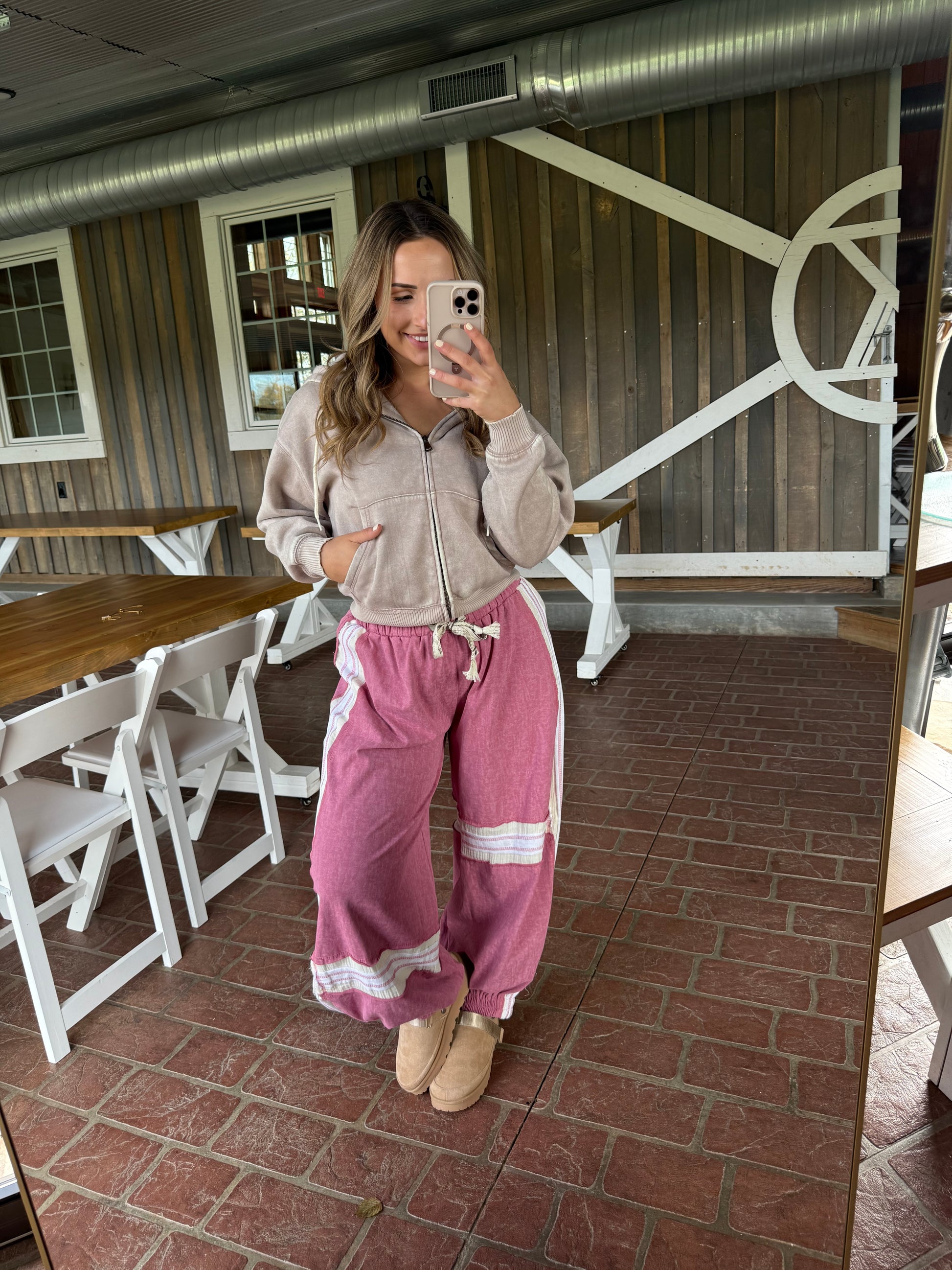 These jogger pants showcase a unique mix of double gauze and color-blocked patchwork for an artisanal touch. The design is elevated with bold overlock stitch accents, exposed outseam detailing, and a waist loop with hand-painted finish that adds a creative edge. A vintage-washed solid color completes the look, giving the pants a worn-in yet modern appeal.