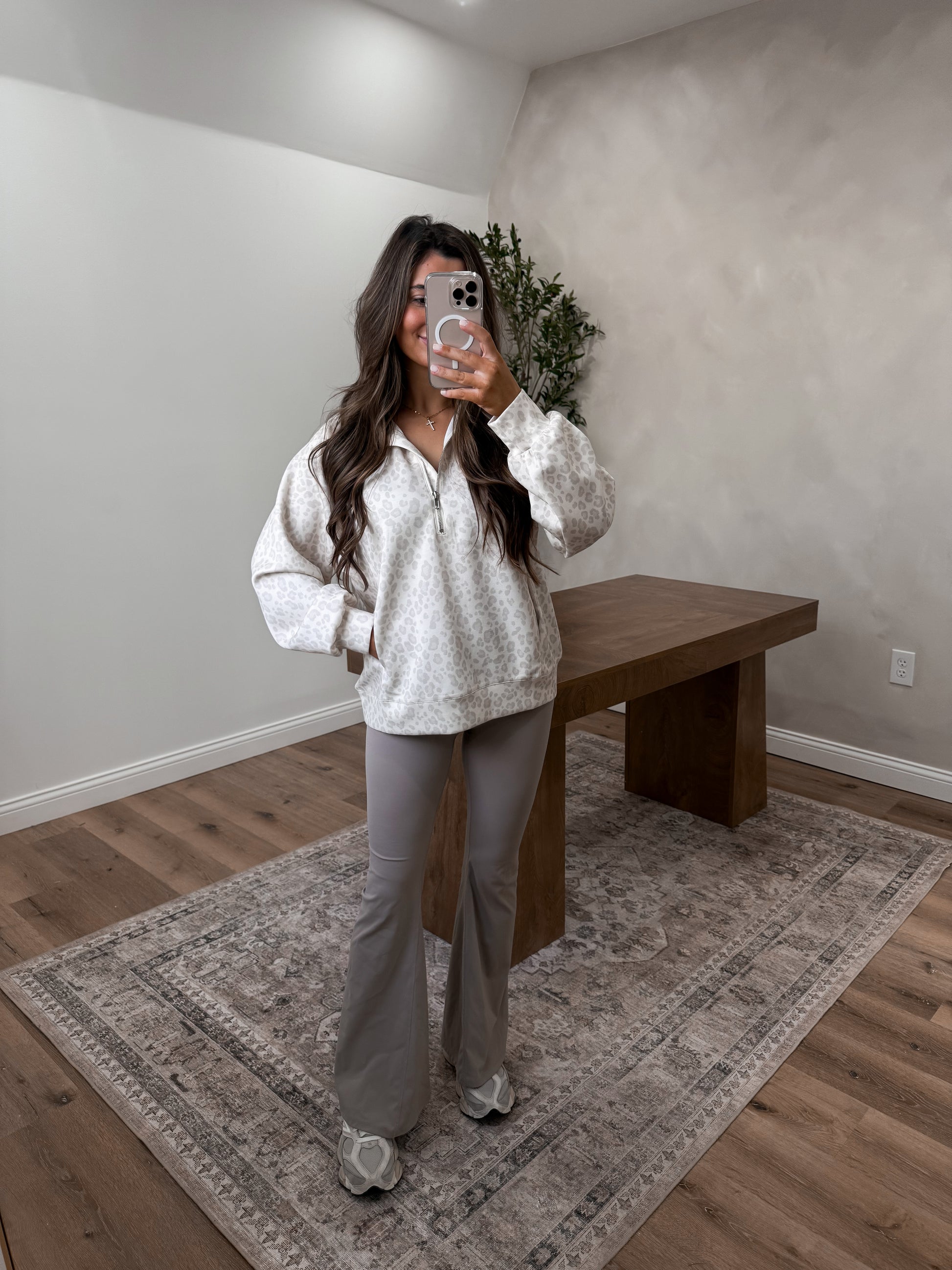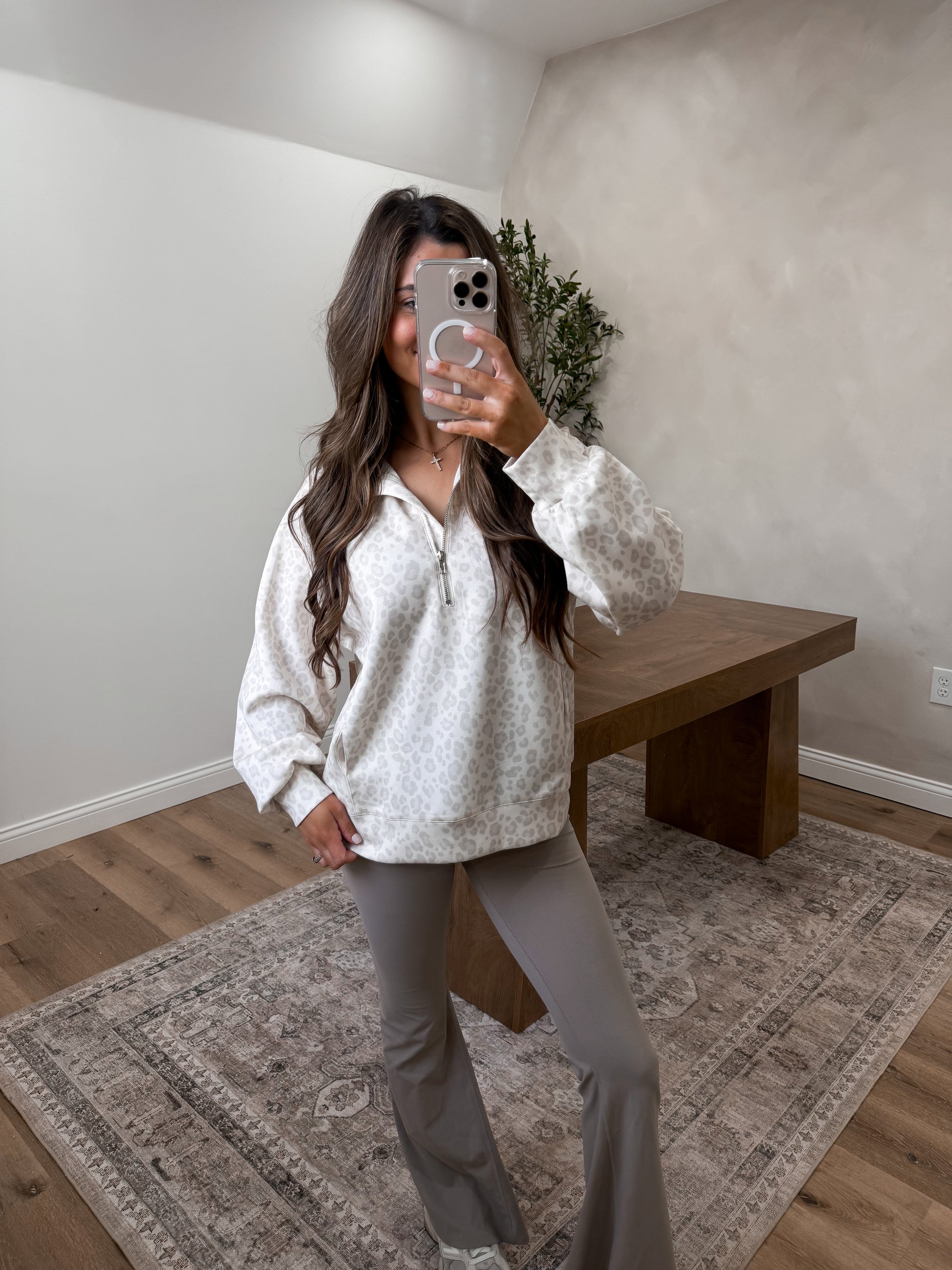 Elevate your casual rotation with the Whitley Leopard Quarterzip, a versatile layer that effortlessly blends style and comfort. Featuring a sophisticated tonal leopard print, this quarterzip pullover delivers understated pattern appeal without overwhelming your look. The soft brushed fleece interior wraps you in warmth, while the stand collar and ribbed cuffs and hem provide a polished silhouette. Perfect for layering over basics or wearing solo, this piece becomes an instant go-to for those days when you want to look put-together with minimal effort.