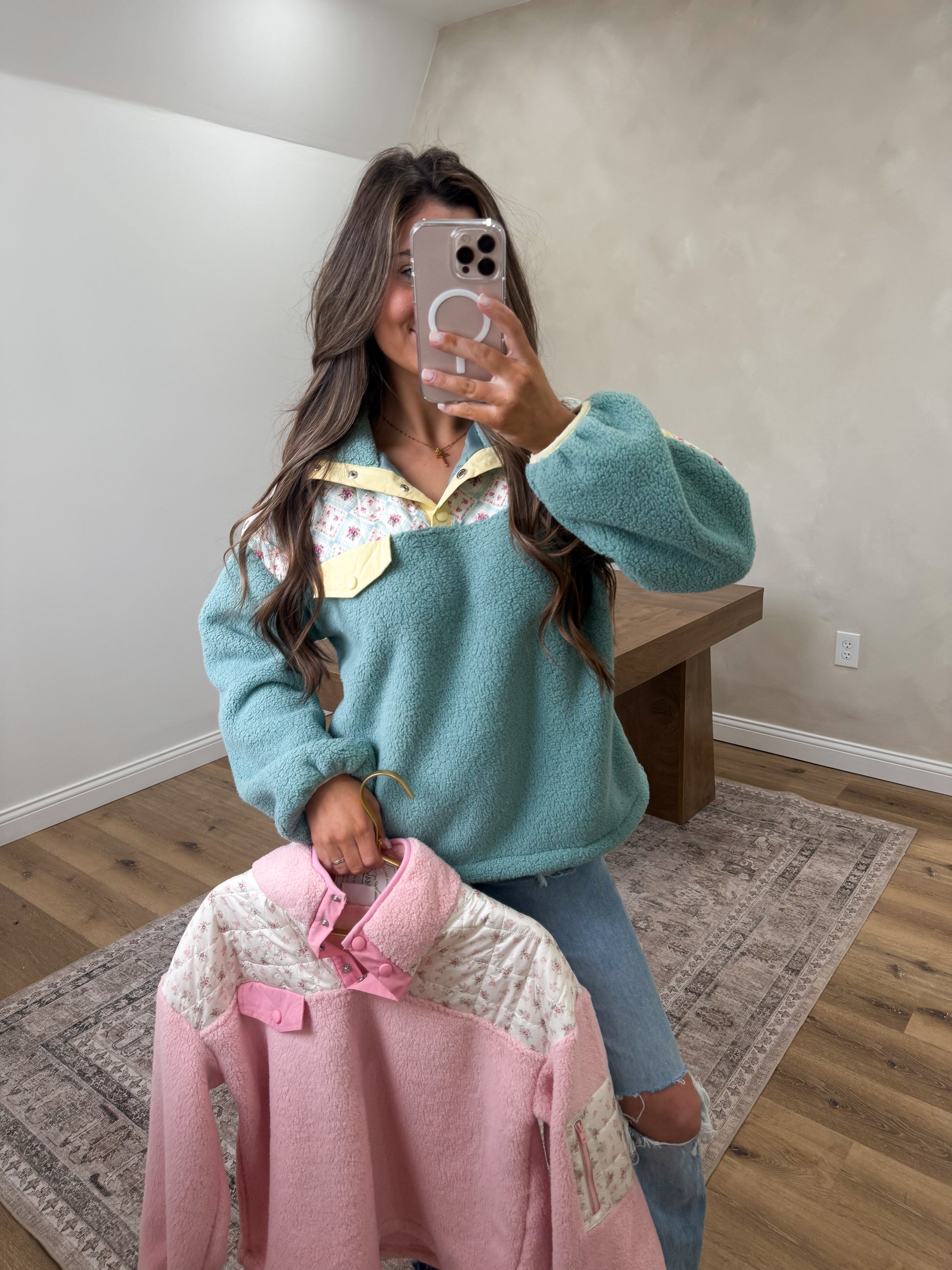 Wrap yourself in cozy comfort with this stunning sherpa pullover, featuring a charming floral quilted design that brings personality to your everyday wardrobe. The half-button front offers easy layering versatility. Delicate florals add a touch of whimsy to this must-have piece that transitions seamlessly from season to season.