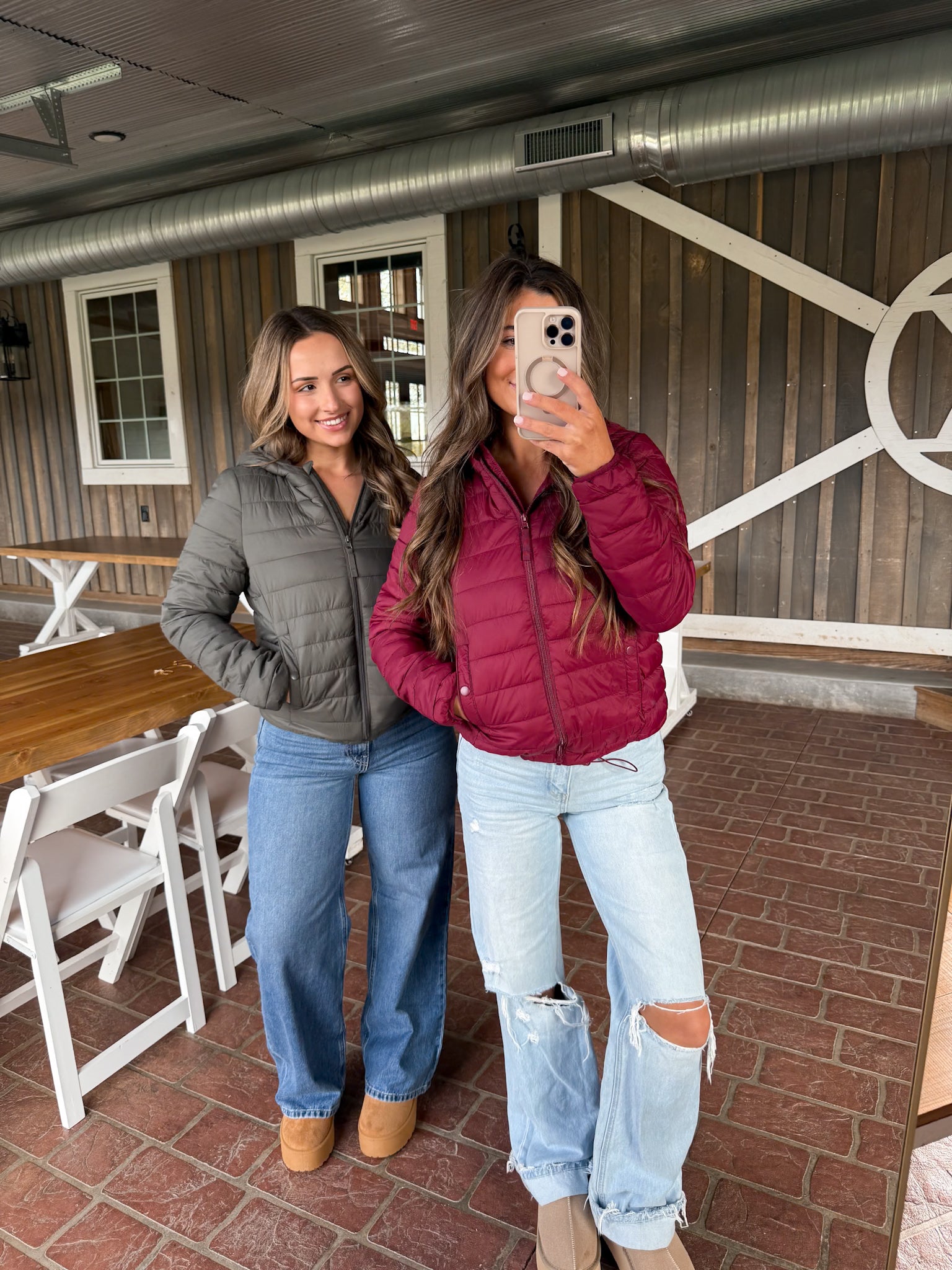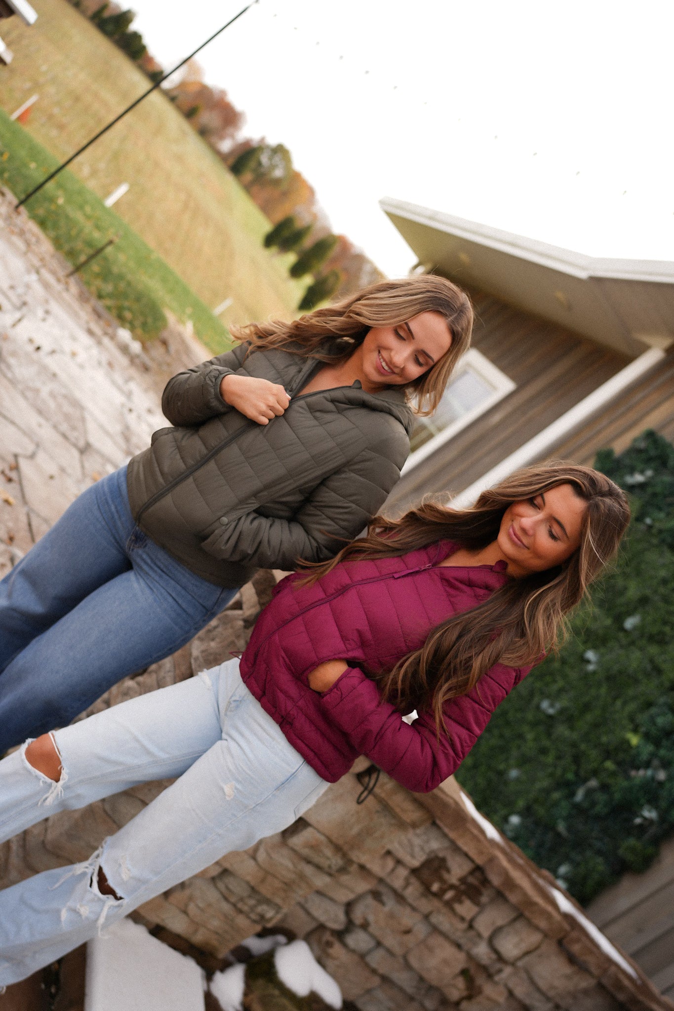 Stay warm without the bulk. This hooded puffer jacket features a streamlined design with strategic padding that moves with you. The adjustable drawstring hood lets you customize your fit, while extended sleeves provide extra coverage. Perfect for layering through transitional seasons or standing solo on crisp days. The rich olive hue complements any wardrobe.