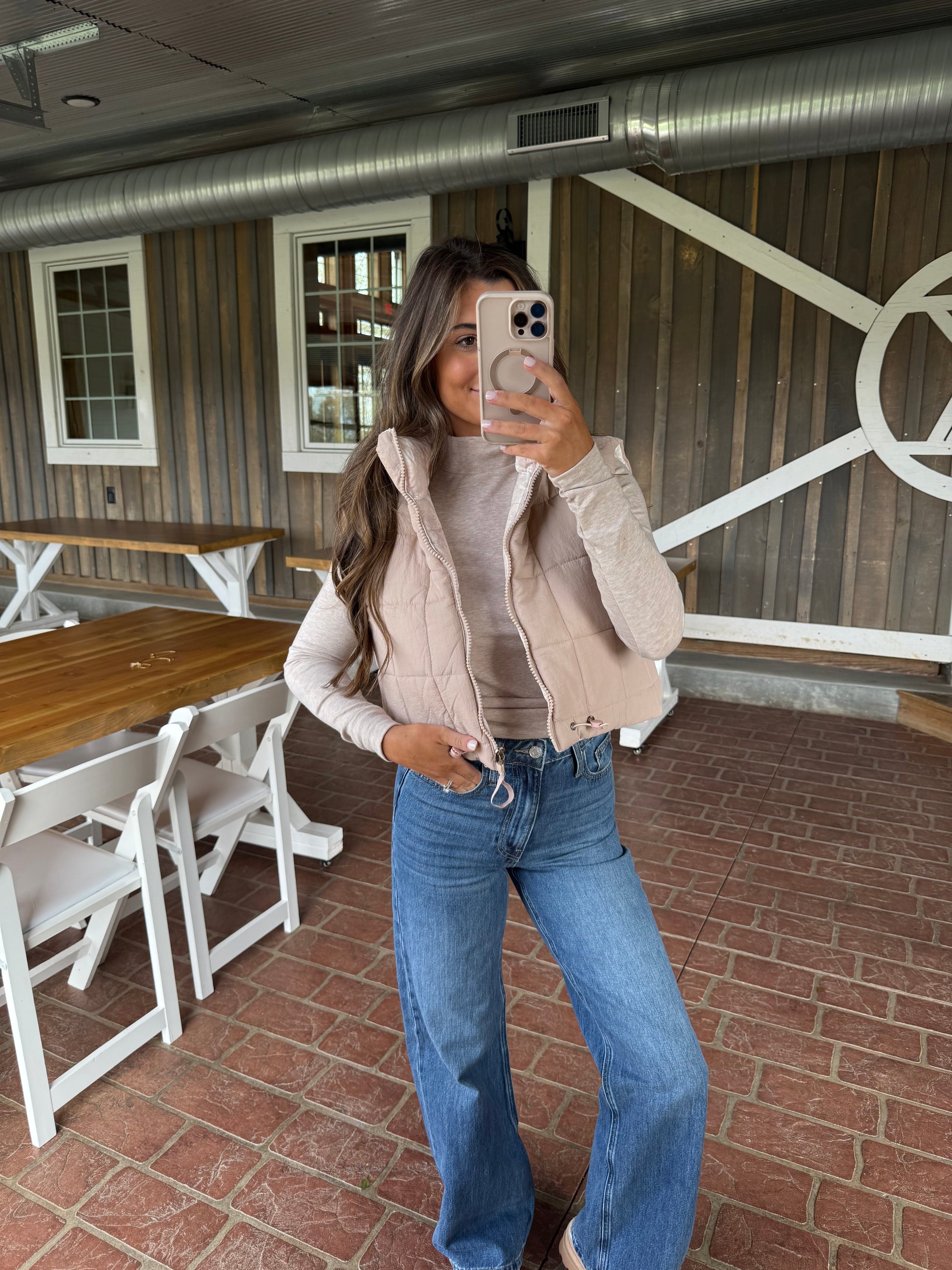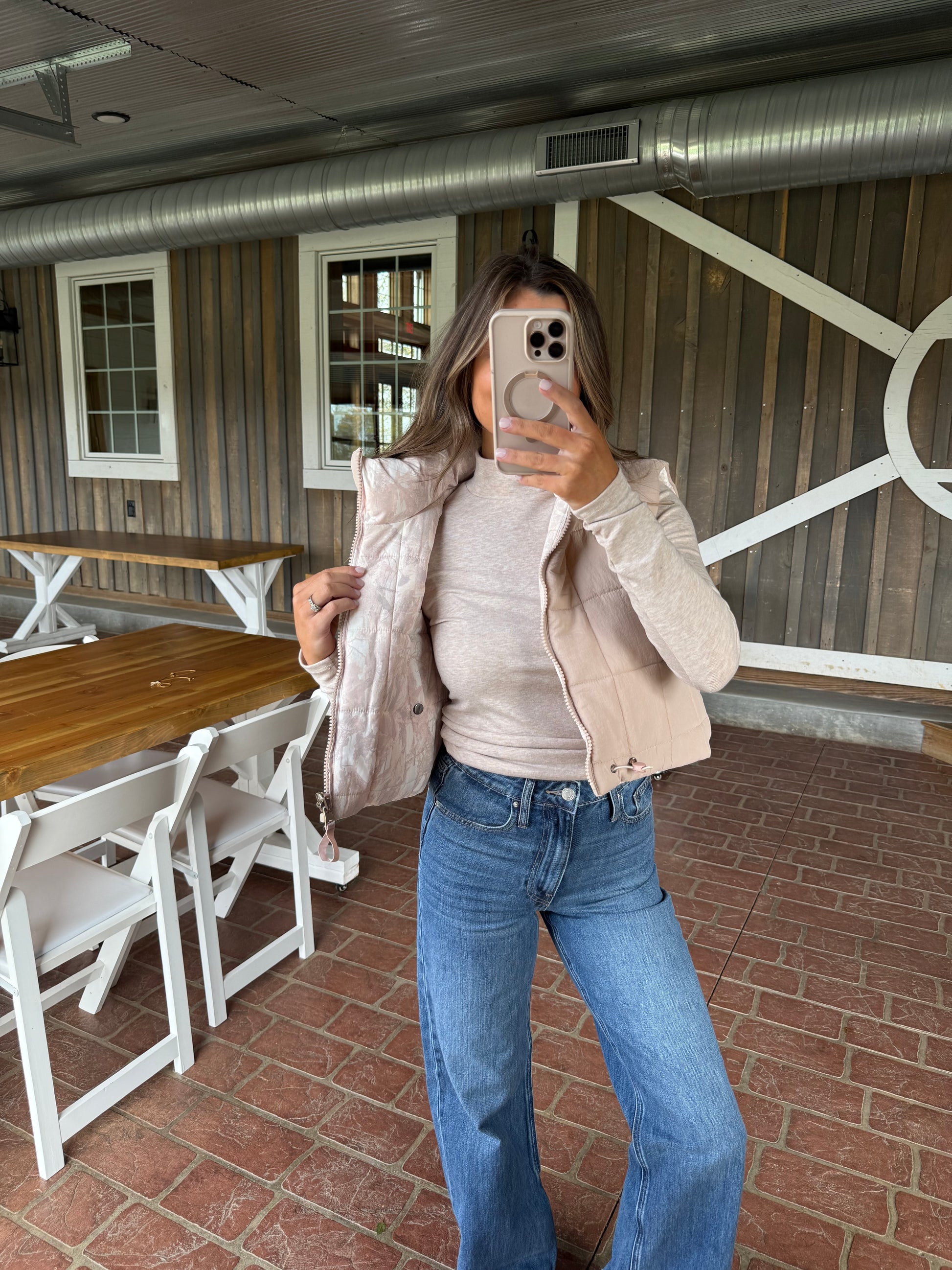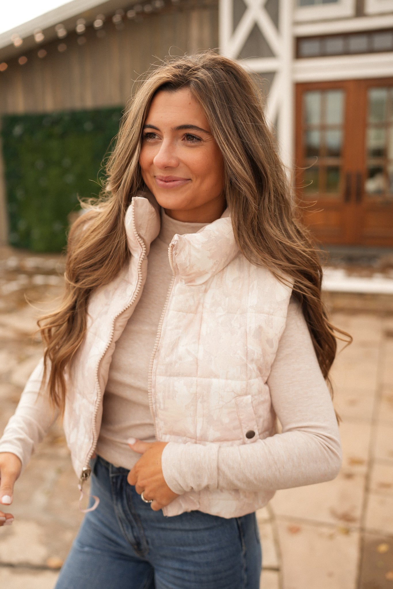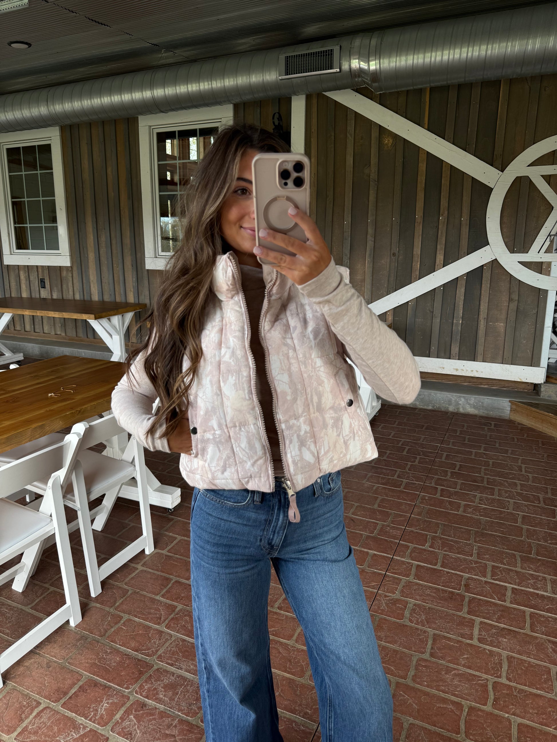 Layer up with versatility in mind. This reversible puffer vest transforms your look with a muted washed camo exterior and soft mauvy beige interior—two styles in one piece. The semi-cropped silhouette flatters while keeping you warm, and functional pockets add practical appeal. Lightweight yet cozy, it's the perfect layering essential that adapts to your mood and outfit.
