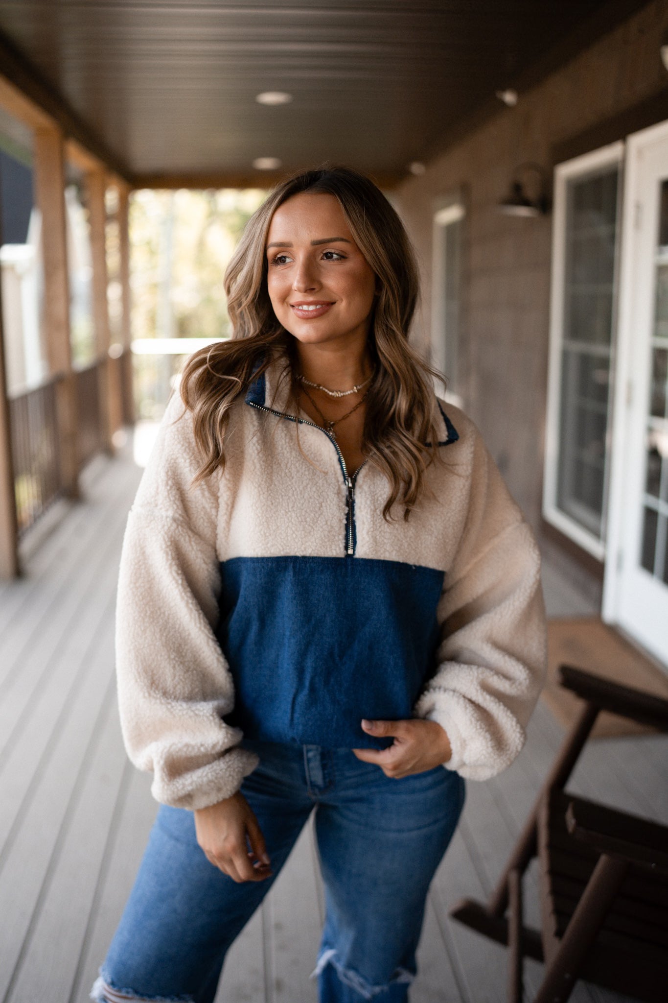 Experience cozy comfort and timeless style with the Sherpa Fleece and Denim Half-zip Pullover.