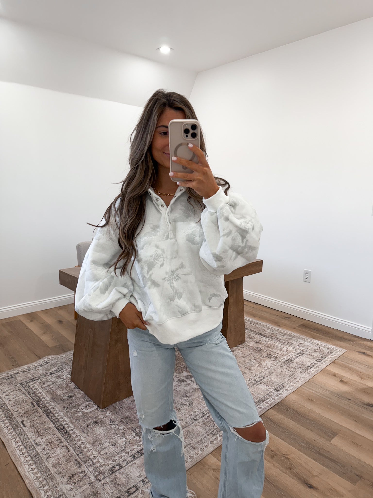 FLORAL PIPER SNAP BUTTON COLLARED SWEATER -Elevated loungewear -Mock neck collar -Silver snap button placket -Relaxed drop-shoulder fit -Ribbed cuffs